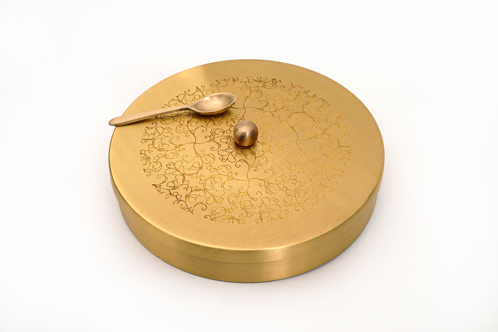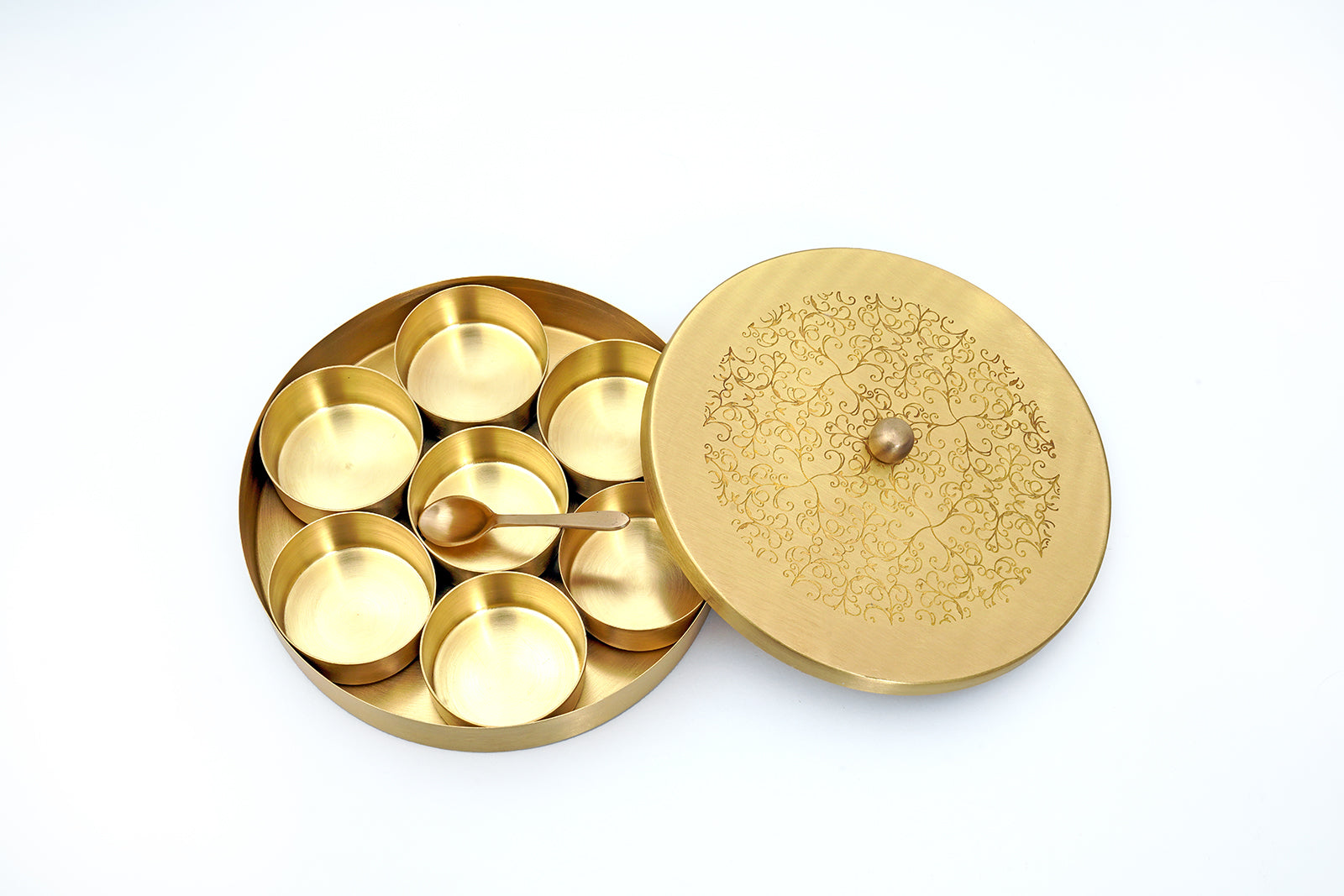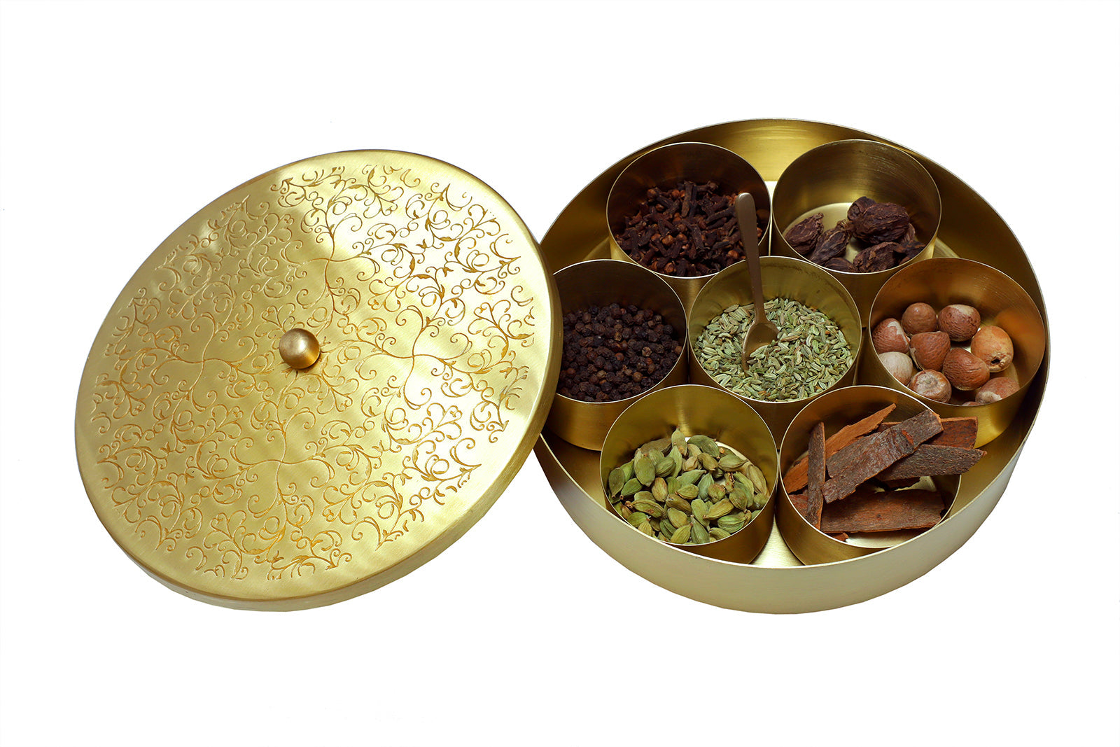 Our exquisite and unique Brass Masaladaan is handcrafted , hand etched in floral pattern. It is finely polished in matt finish . This beautiful spice box will not only uplift the aesthetic of your kitchen but also adds to the health benefits of your food. It is an ideal gift for the house warming party of your loved ones. The skilled and trained artisans of India have made this Brass Masaladaan with utmost care and perfection.