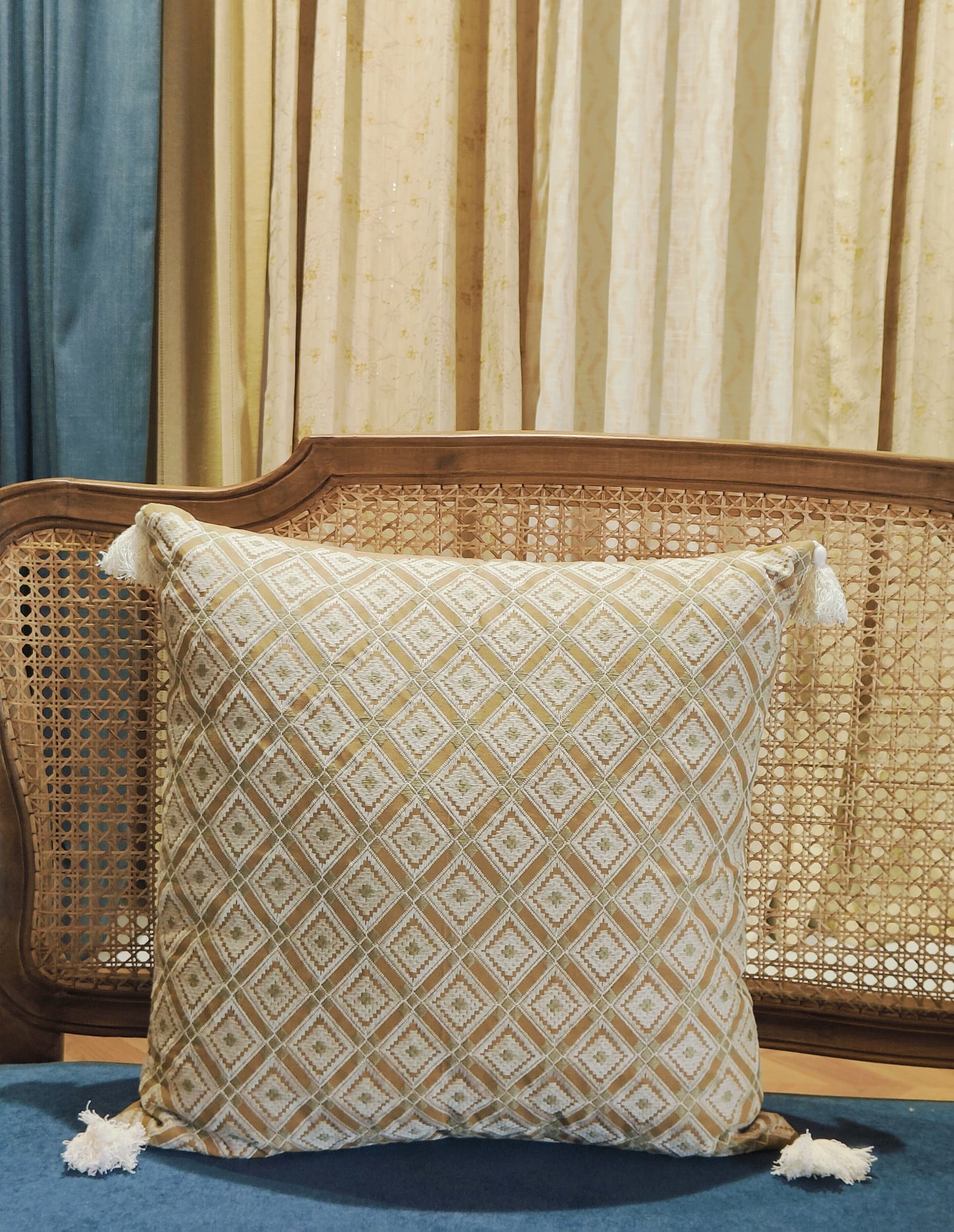 Elevate your home decor with this luxurious diamond-patterned cushion, designed to add style and comfort to your living space. The cushion features a timeless geometric diamond design in neutral tones, making it versatile enough to complement any interior theme. Soft, durable fabric ensures long-lasting use, while the tassels on all four corners bring a playful yet elegant touch to its overall look.