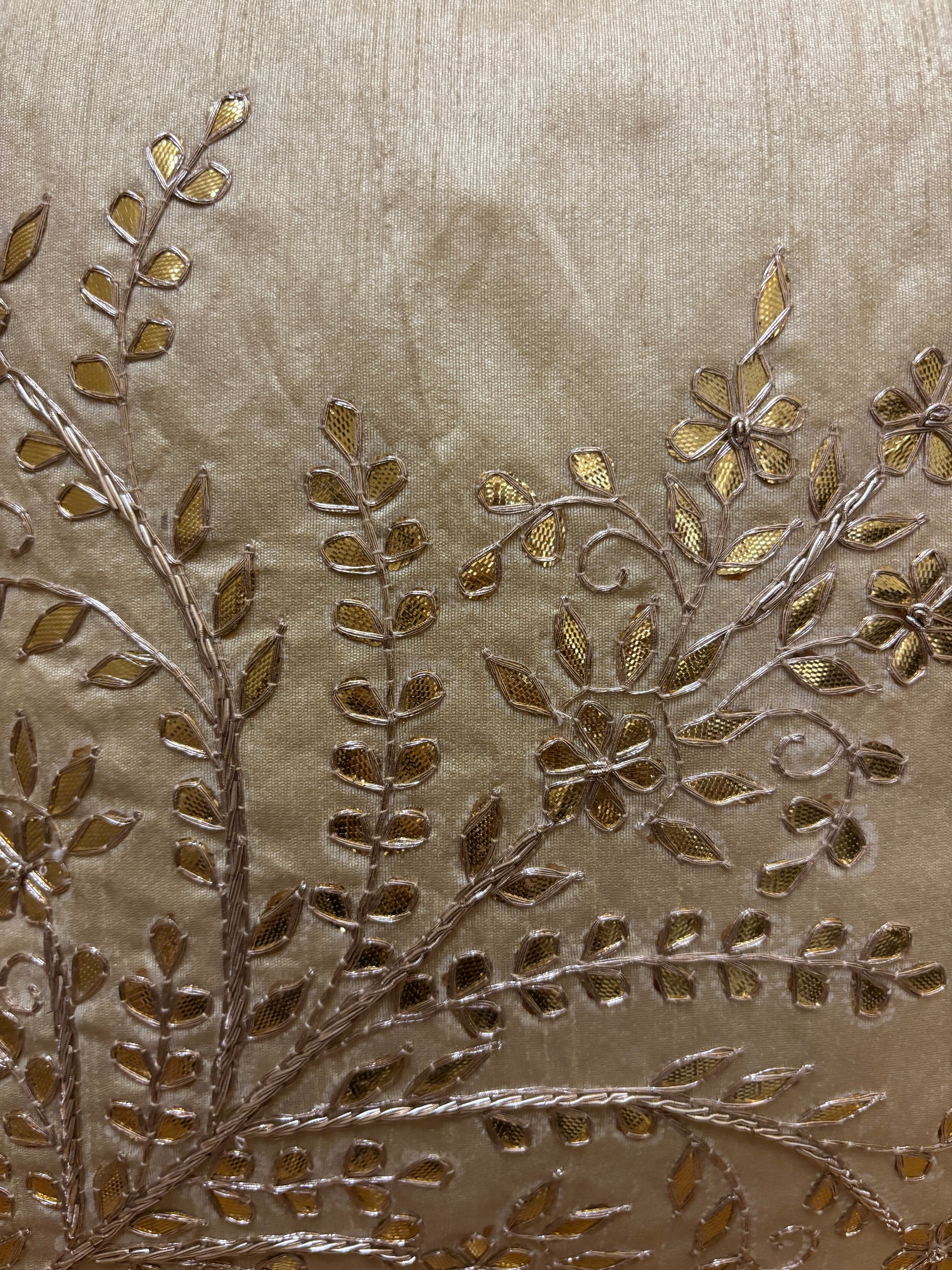 - Design: Handcrafted gota patti embroidery with detailed floral and leaf motifs