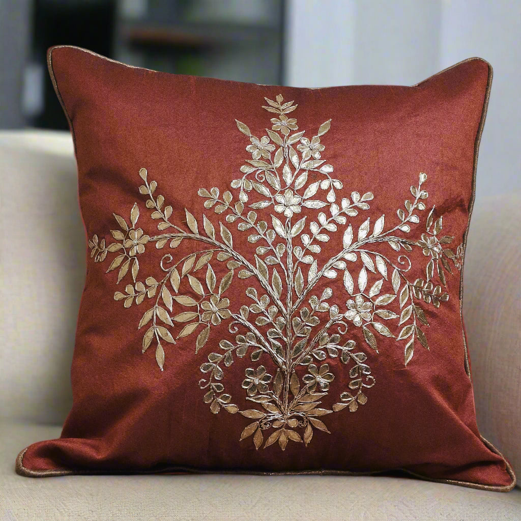 Elevate your home decor with this luxurious brown gota patti cushion cover. Featuring an intricate floral pattern in golden gota work on a rich brown silk fabric, this cushion cover exudes elegance and sophistication. The shimmering embroidery adds a royal touch, making it perfect for special occasions or to give your space a festive vibe.
