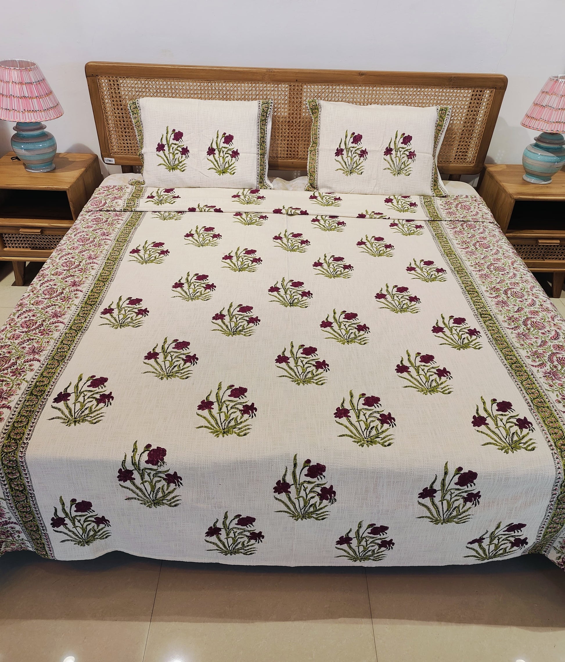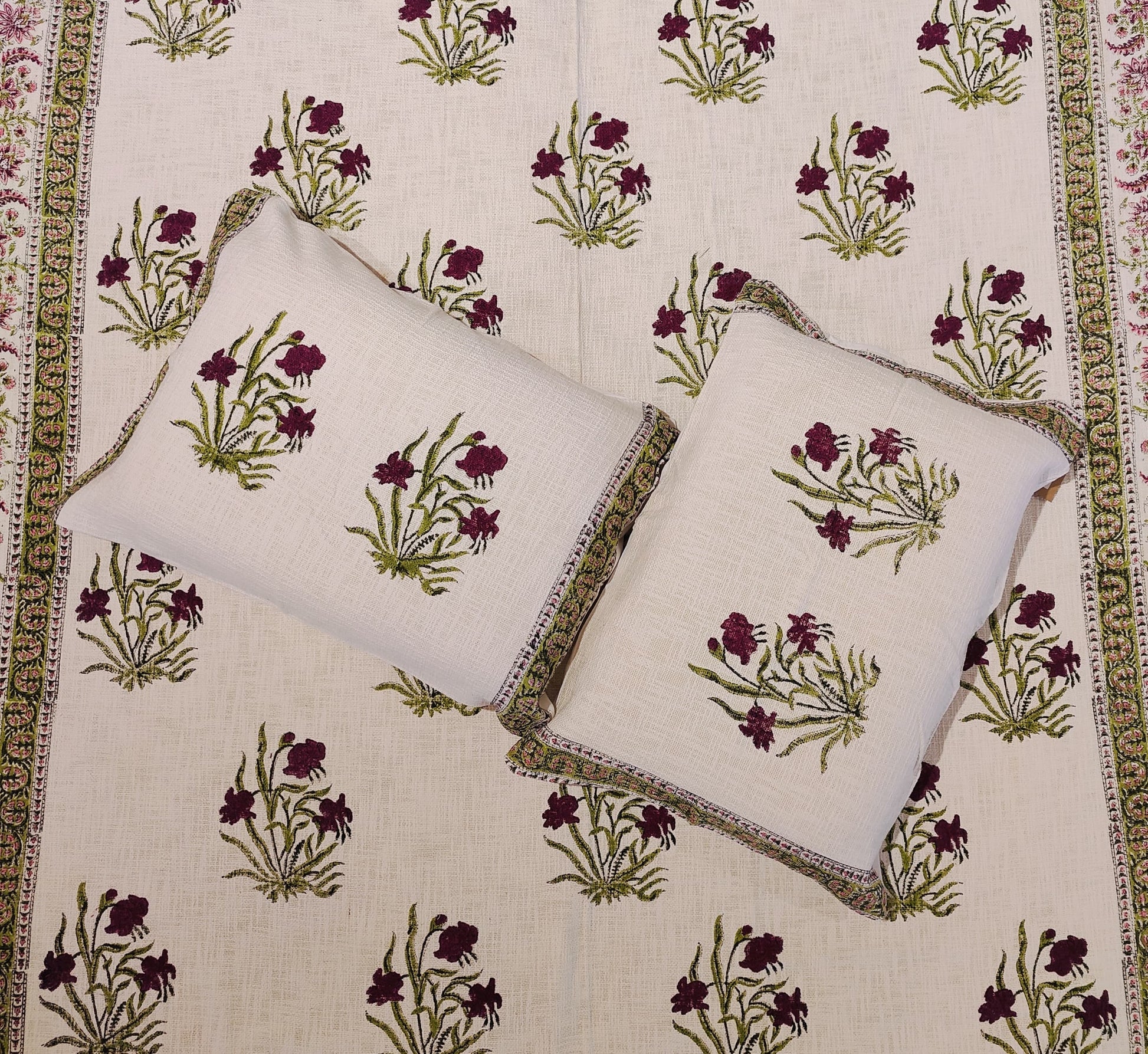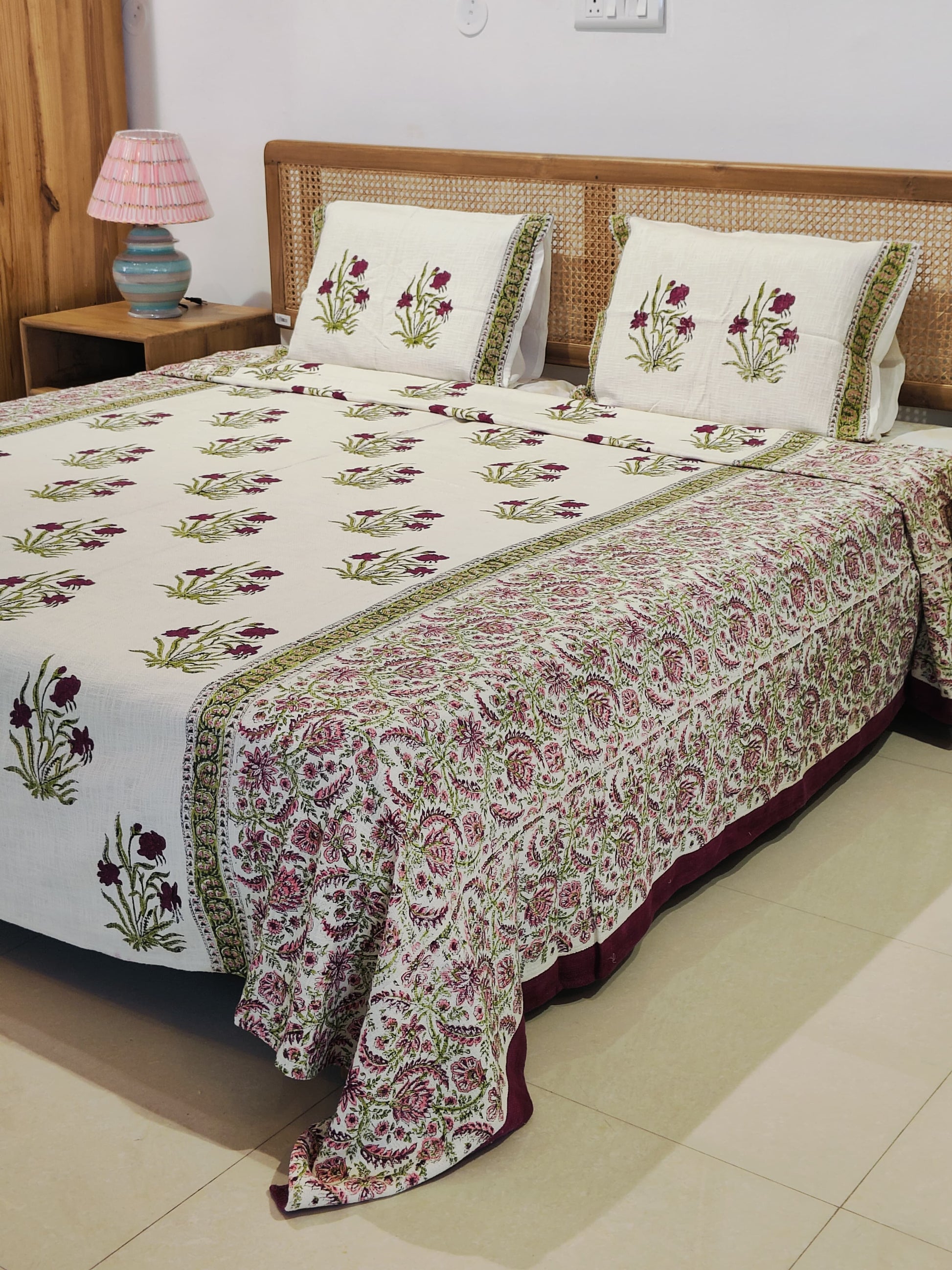 Wrap your room in timeless elegance with the Gulbagh Handblock Cotton Bedcover Set. This beautifully handcrafted bedcover features traditional Indian floral motifs in deep maroon and olive green, artfully block-printed on soft, breathable cotton. A paisley border frames the central pattern, adding a rich touch of heritage charm. Complete with two matching pillow covers, this set brings a blend of comfort and craftsmanship to your bedroom.