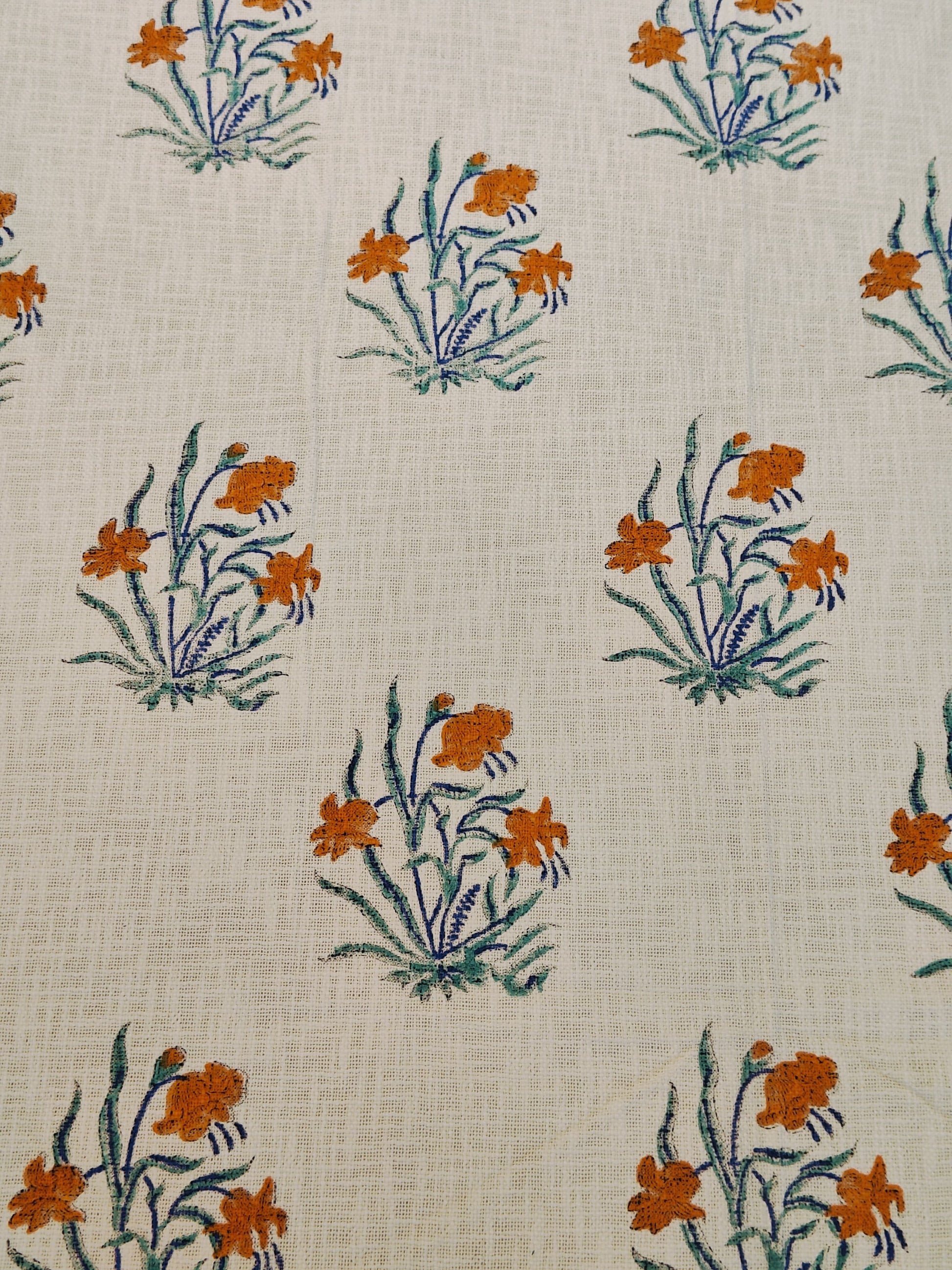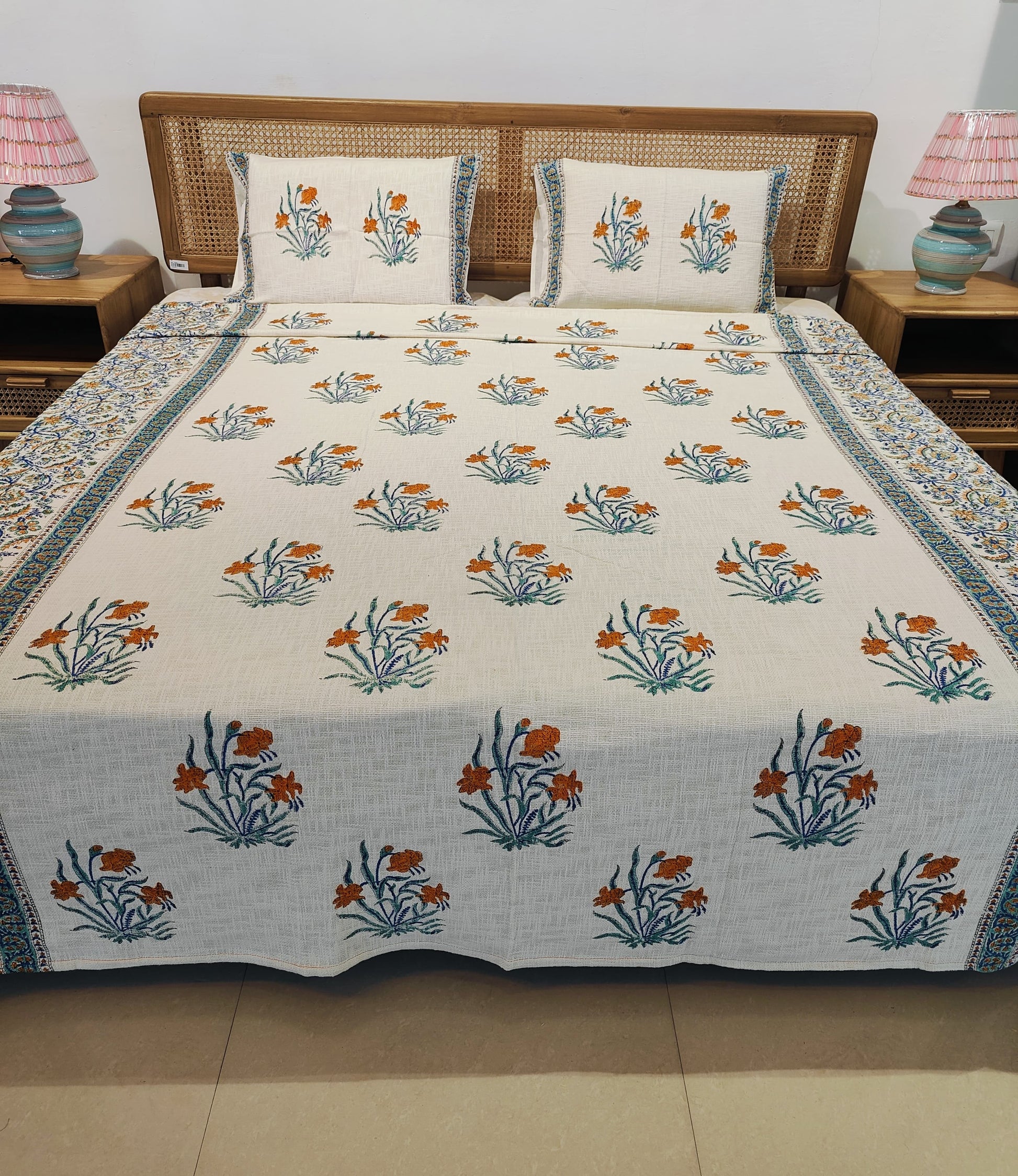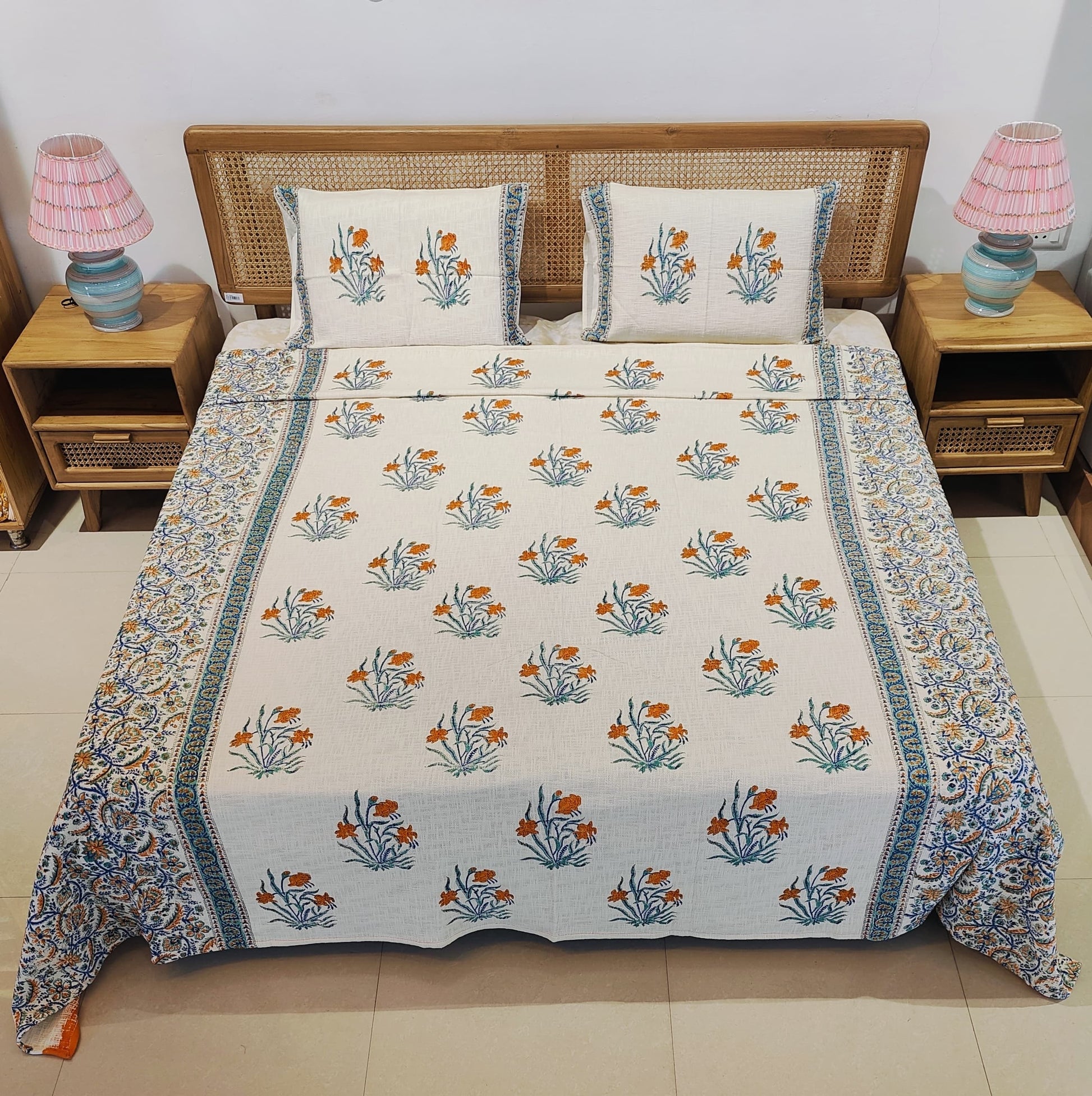 Brighten up your space with the refreshing tones of the Neelkamal Handblock Cotton Bedcover Set. This handcrafted set features vibrant orange floral bunches with soft teal-green stems, delicately block printed on a cream cotton base. The look is framed with an intricate blue paisley border that adds a graceful balance to the bold florals. Ideal for adding a touch of artisanal charm to your bedroom, this set includes two matching pillow covers.