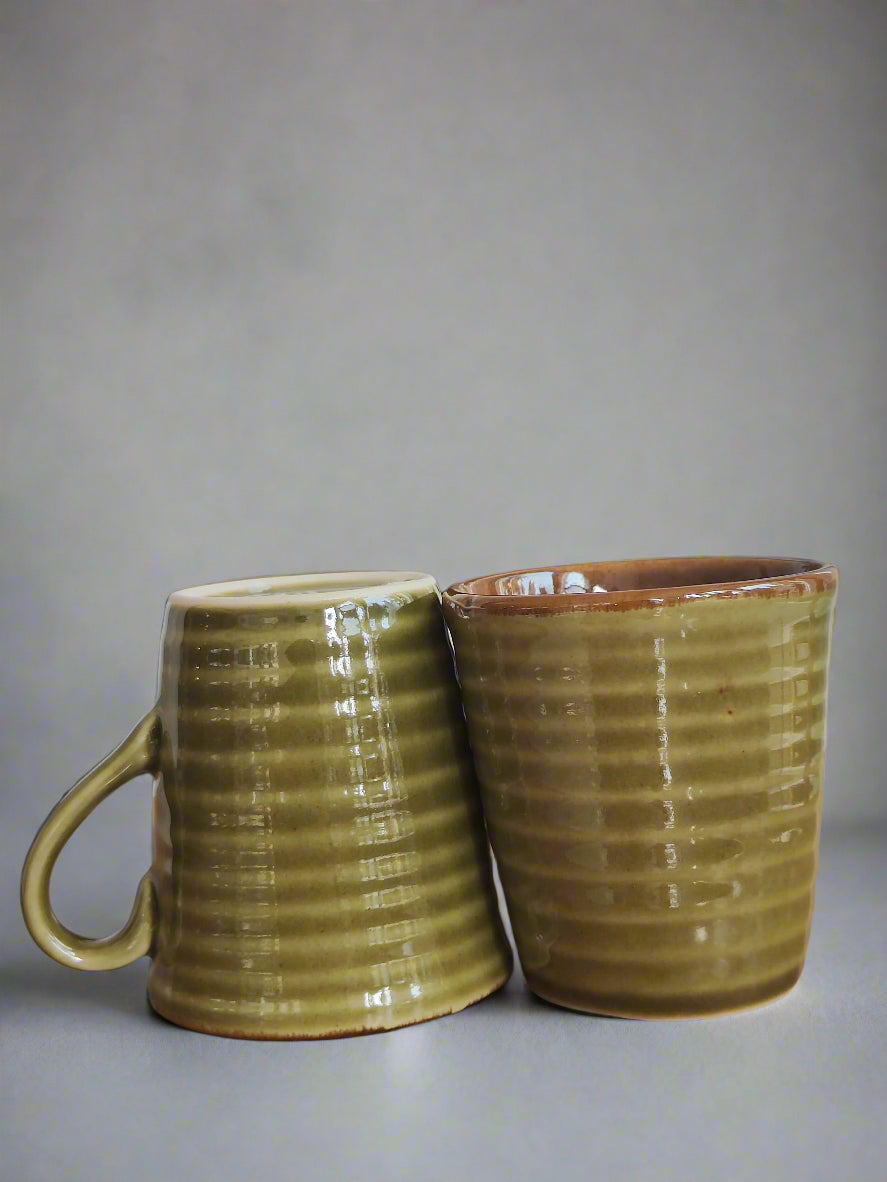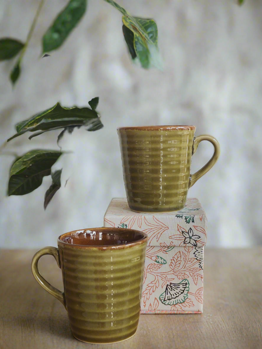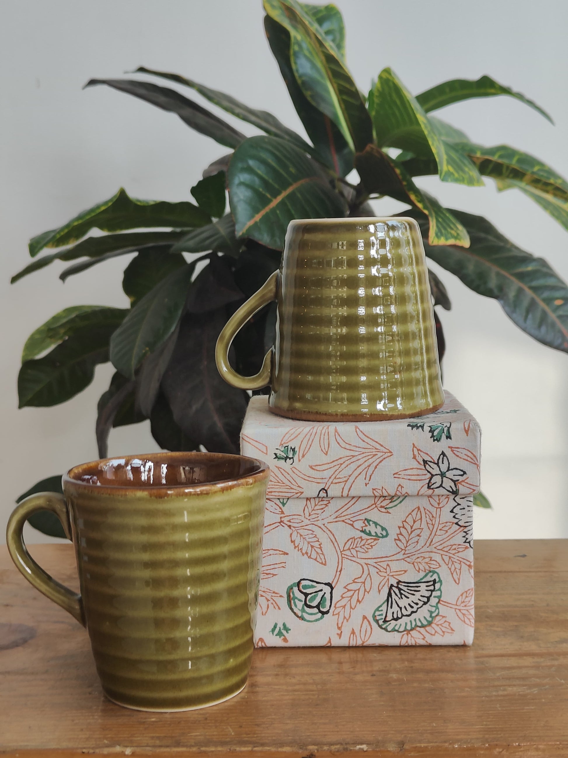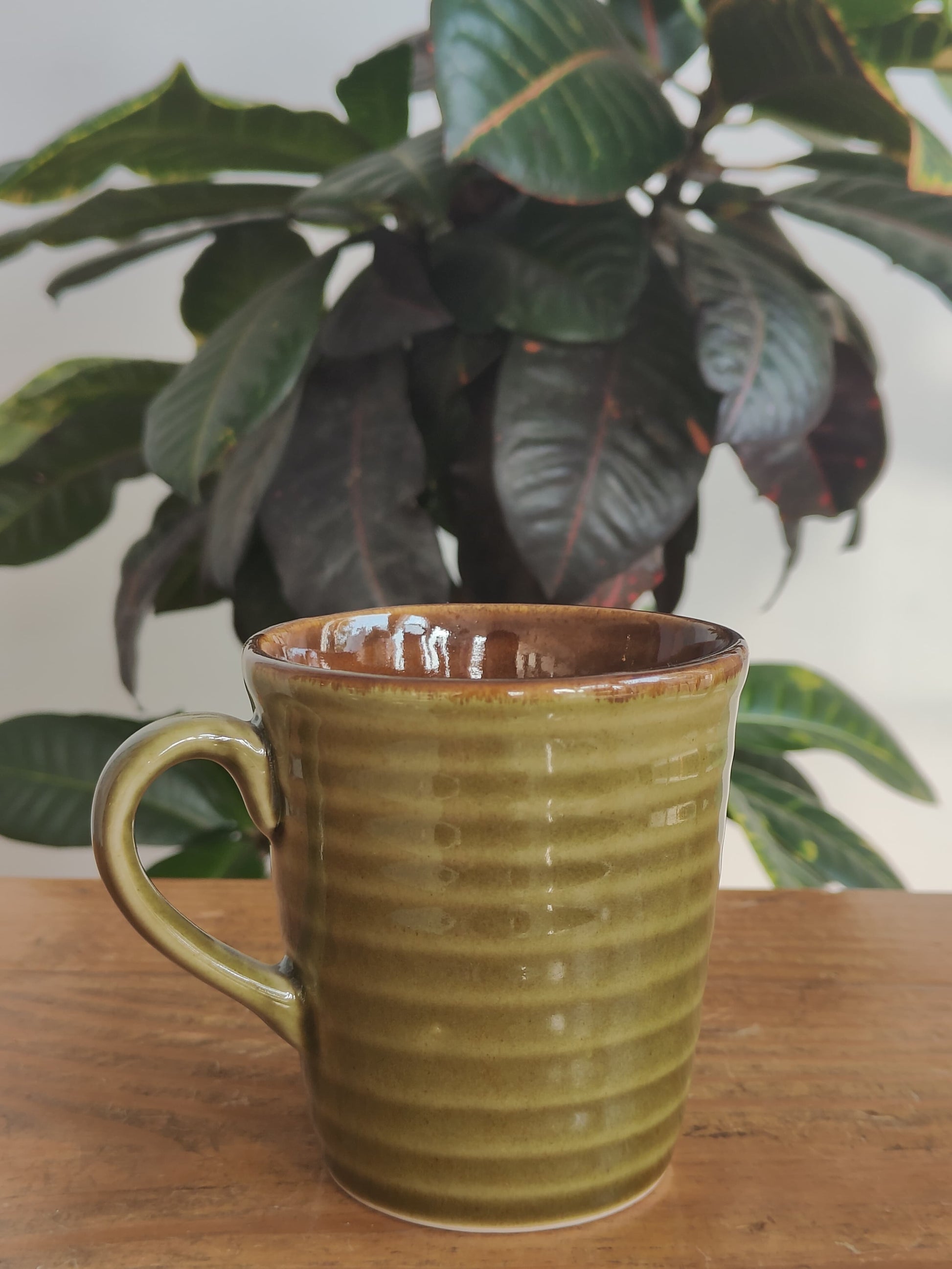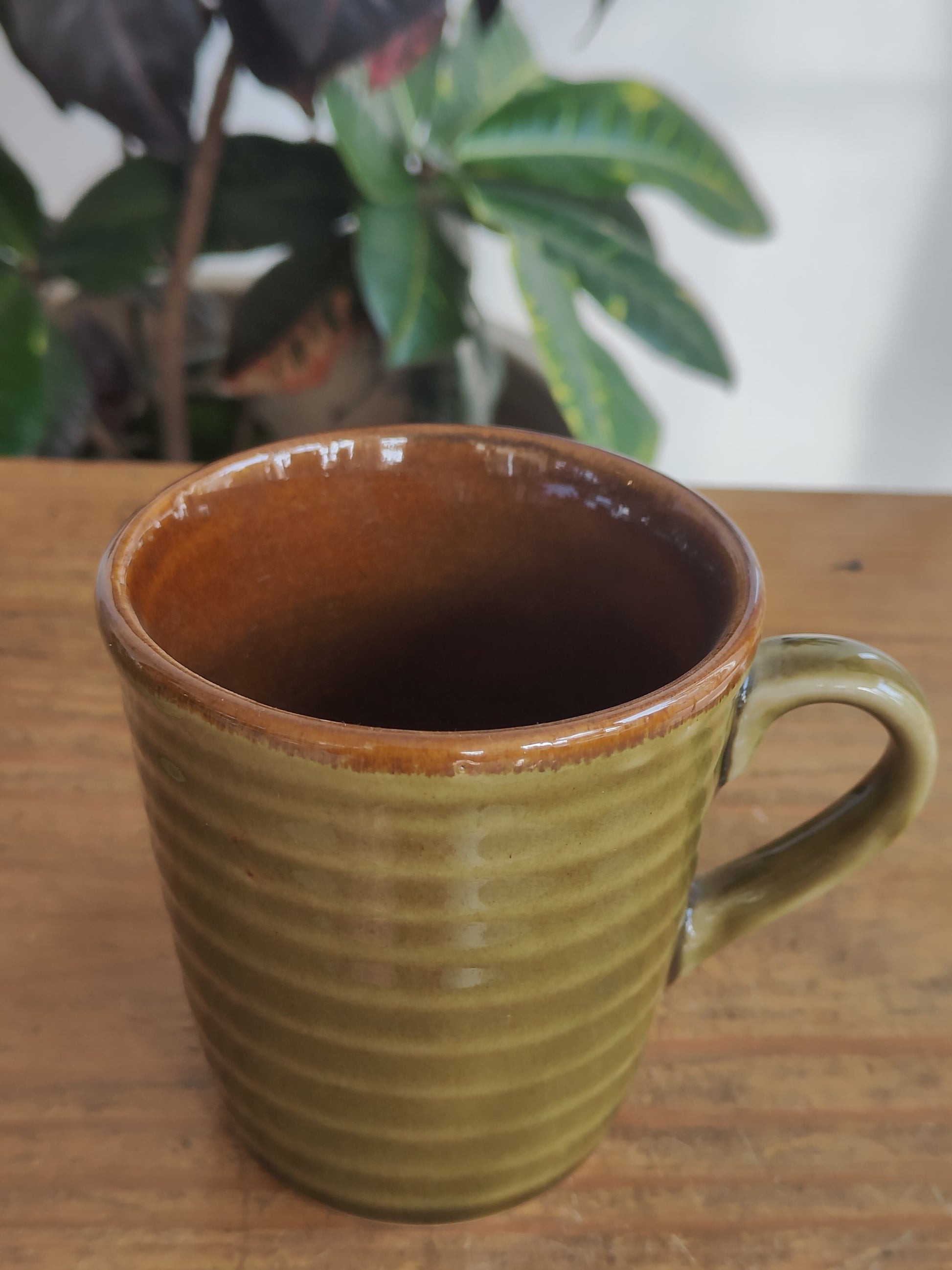 Crafted for comfort and charm, the Olive Ridge Mug pairs a warm olive glaze with gentle ribbing for a tactile experience. The deep brown interior adds contrast and depth, making it as inviting to hold as it is to sip from.