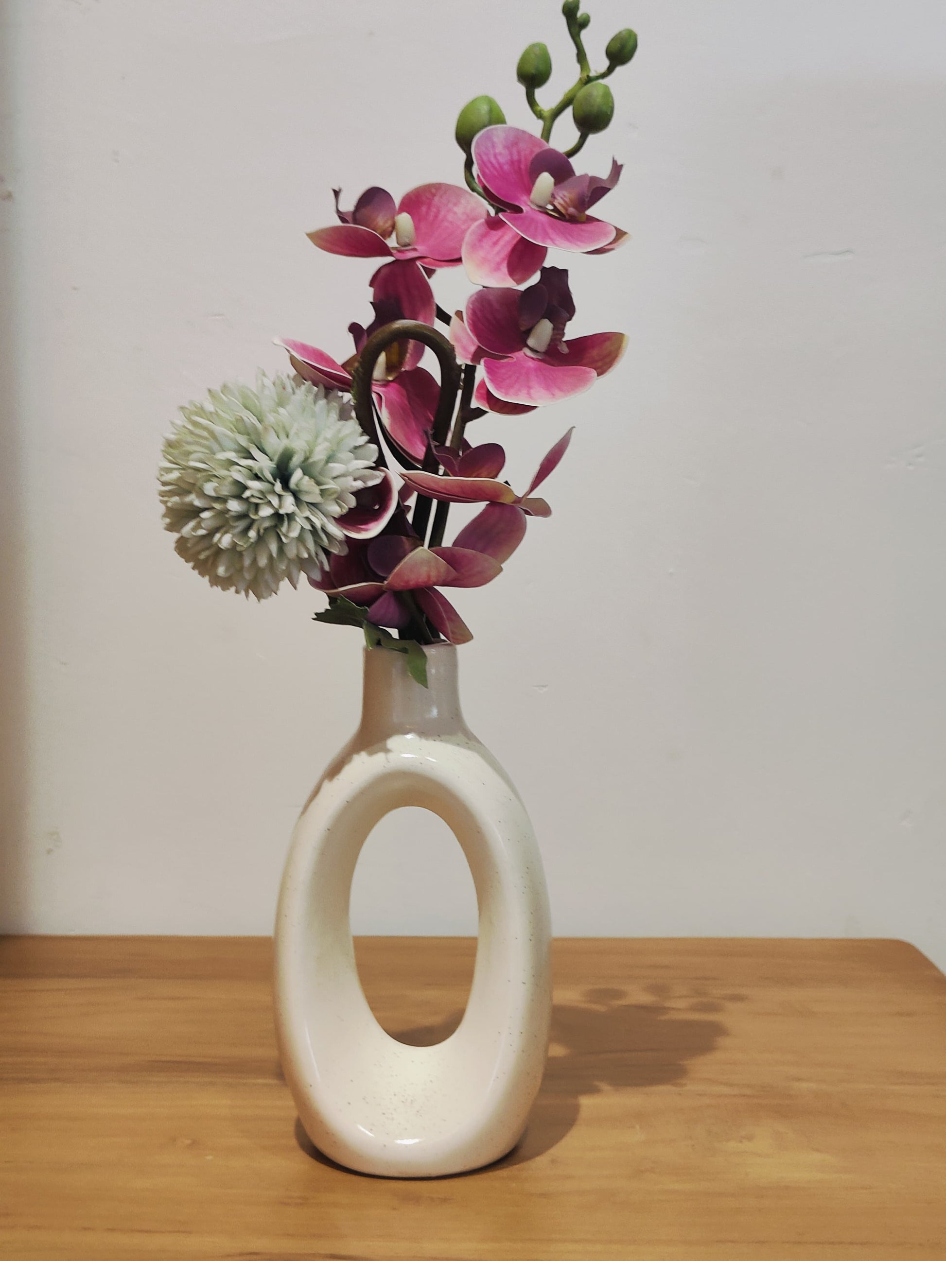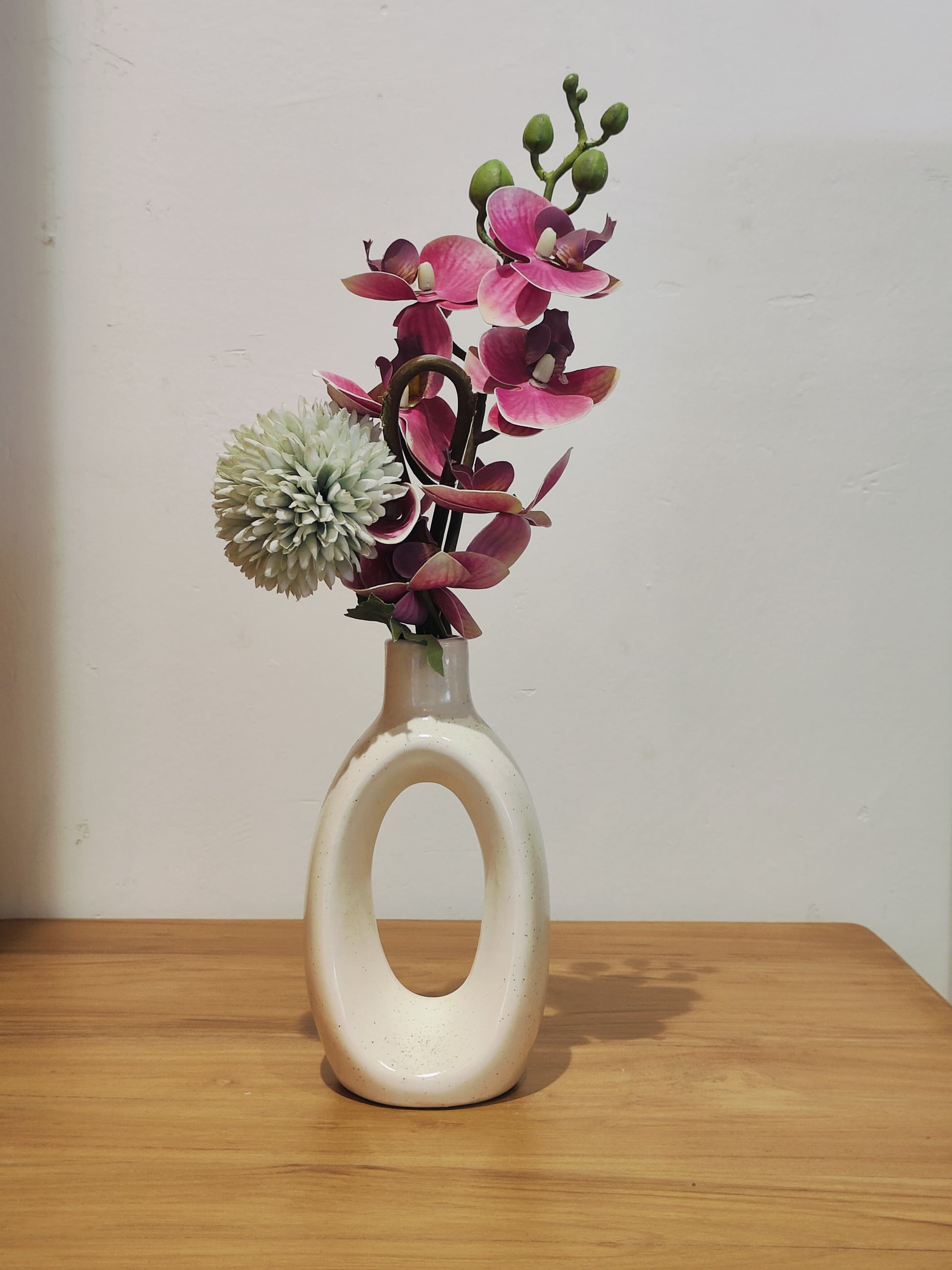 Bring a touch of contemporary sophistication to your home decor with our Ceramic Ring Bottle Vase. Crafted from high-quality ceramic, this unique vase combines the timeless appeal of traditional pottery with a modern, oval hollow-inspired design. Its sleek, streamlined shape makes it a perfect statement piece for any room in your home, whether displayed alone or with your favorite flowers.