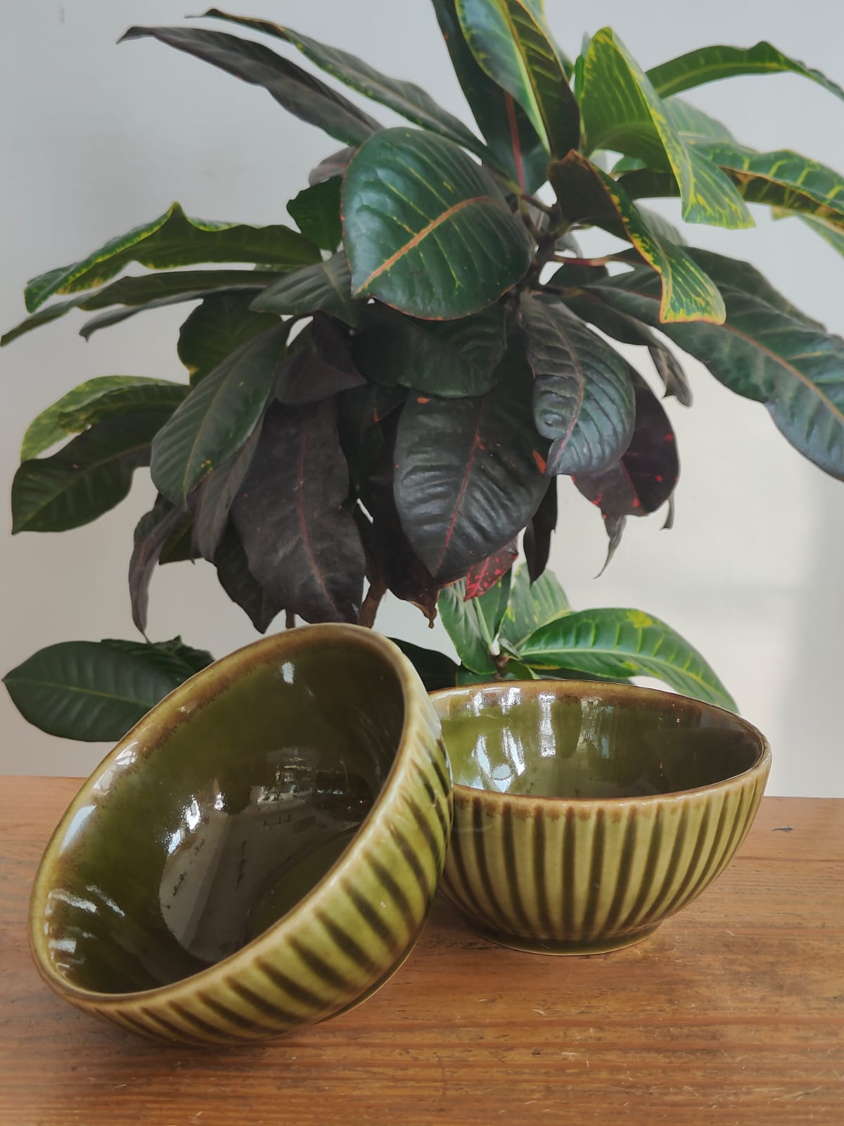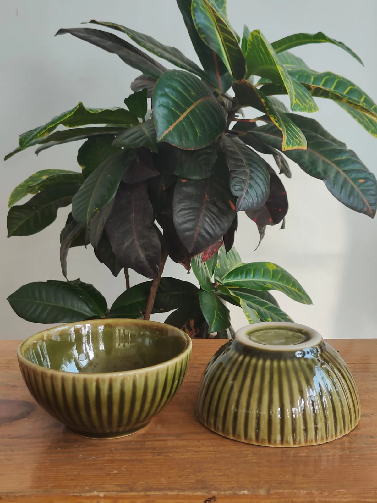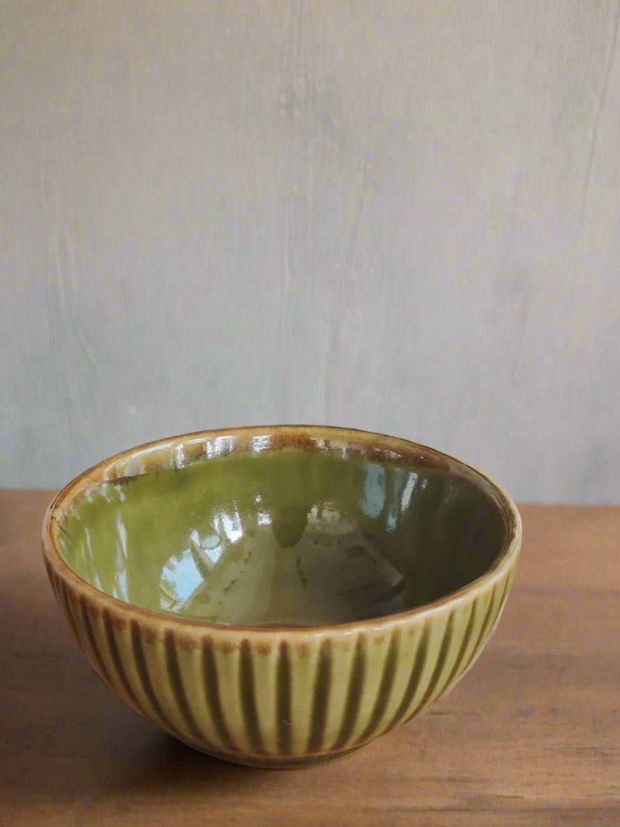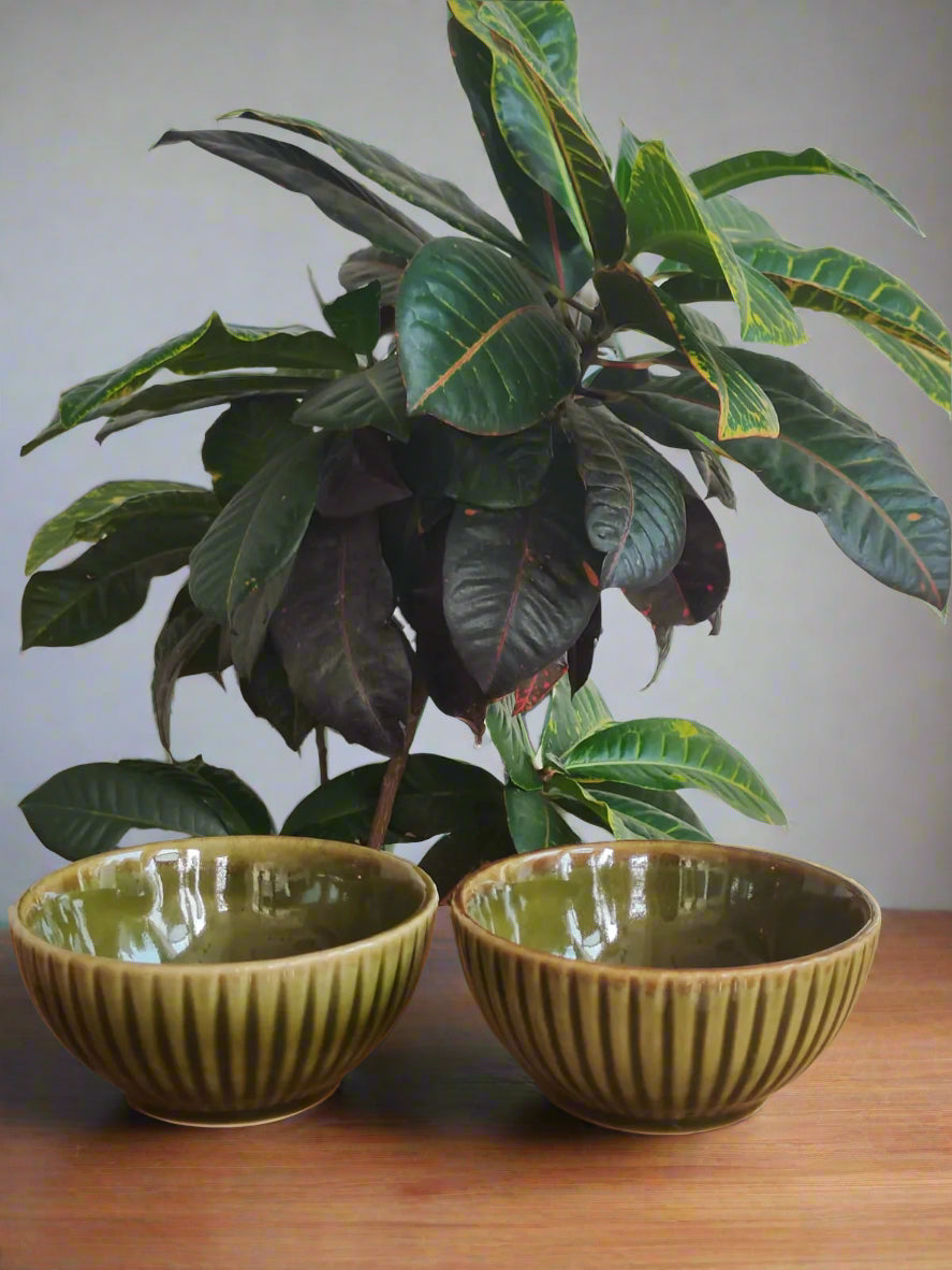 Celebrate understated elegance with the Set of Olive Ridge Bowl, a handcrafted ceramic piece that brings texture and warmth to your table. Its vertically fluted exterior features earthy olive tones with a rich brown rim, while the glossy inner glaze enhances the bowl's organic charm.
