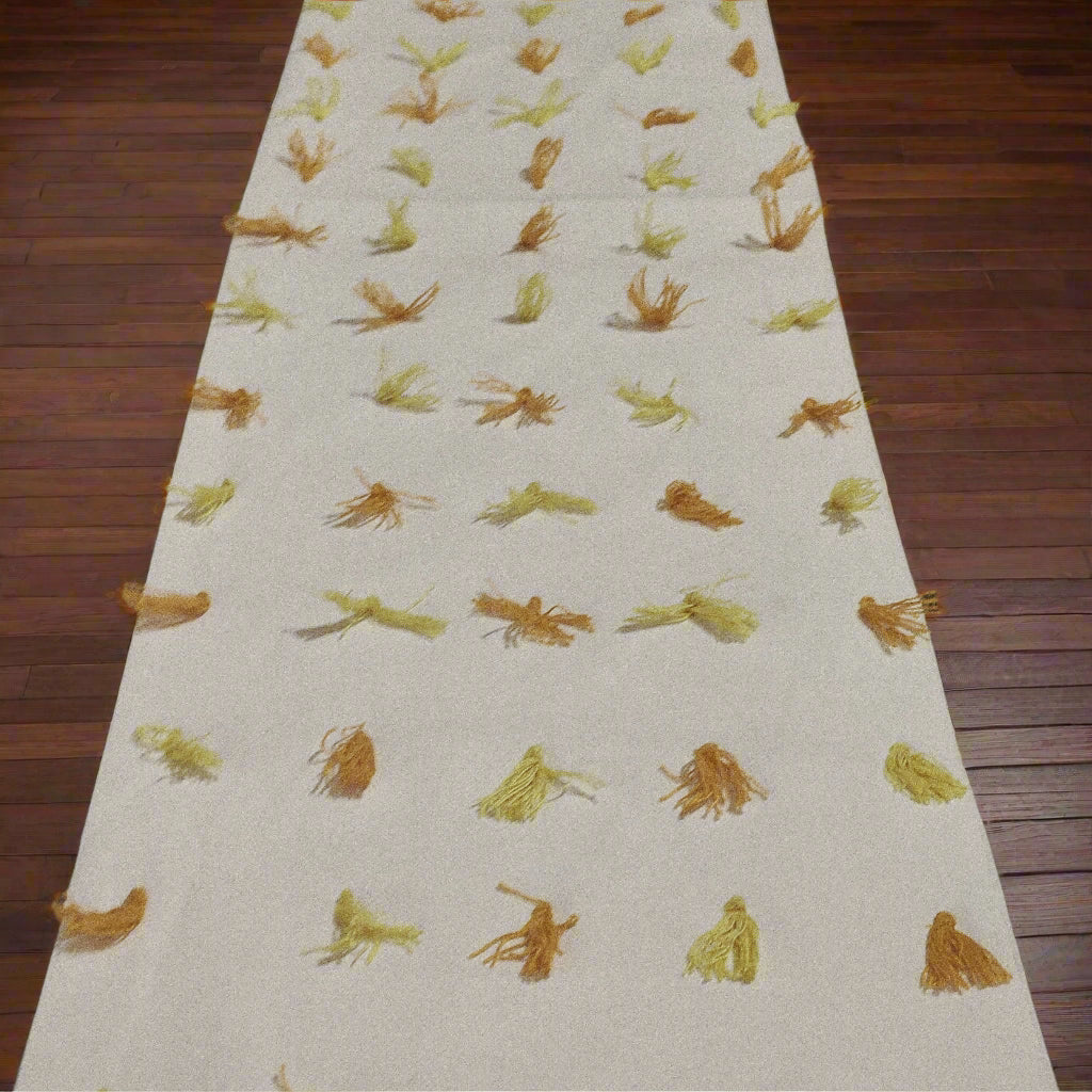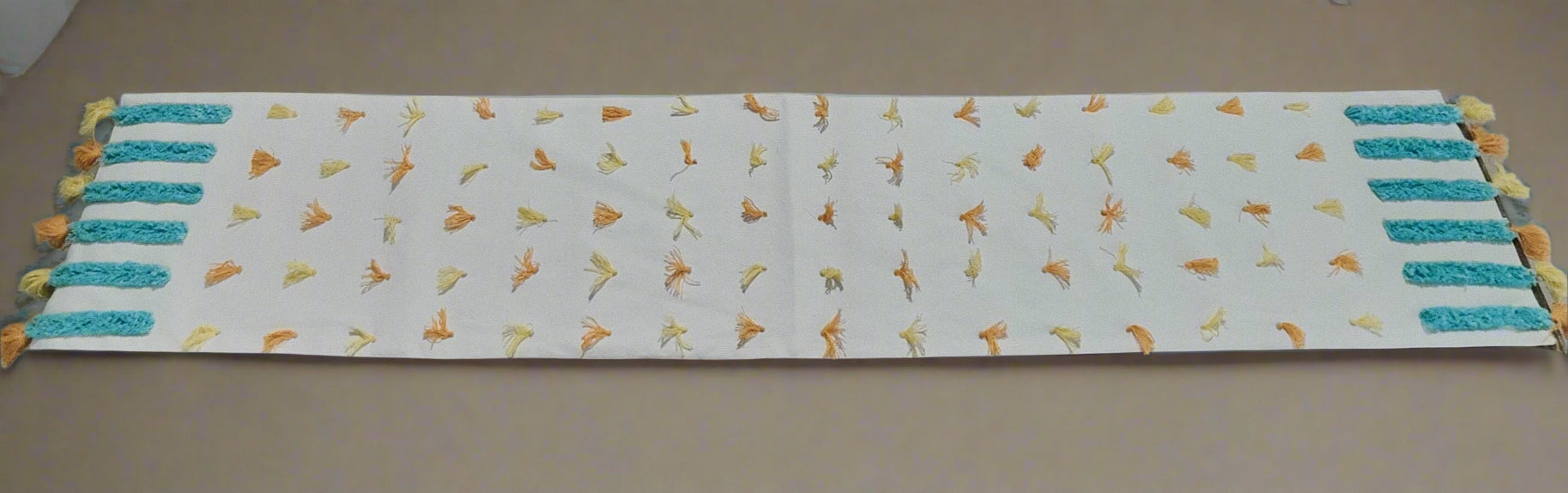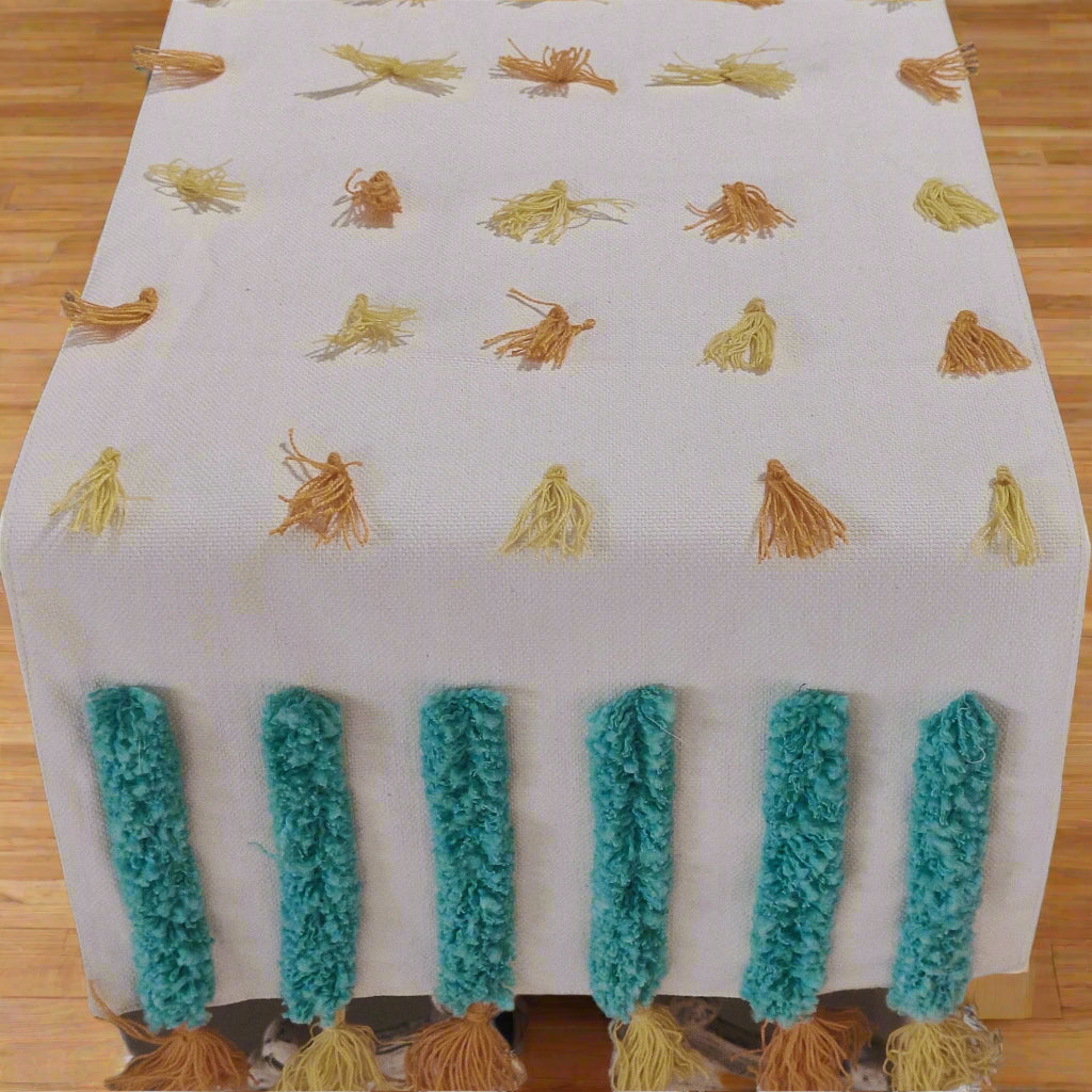 Table runner tufted made from premium quality fabric, it features a playful scatter of delicate tassels in soft yellow and rustic orange shades across the surface. The edges are adorned with striking vertical teal textured accents, adding a bold and contemporary twist. Each end of the runner is finished with a row of charming tassels, creating a lively, bohemian-inspired look.