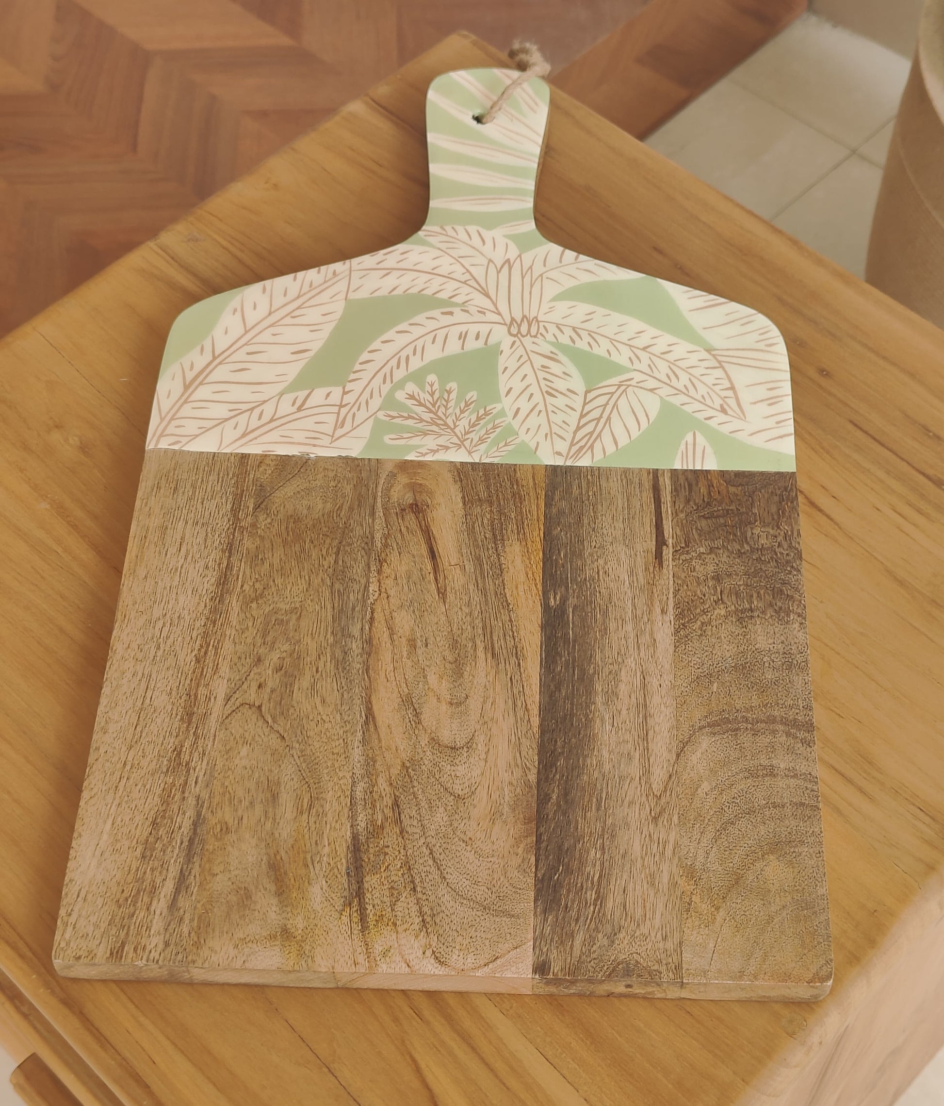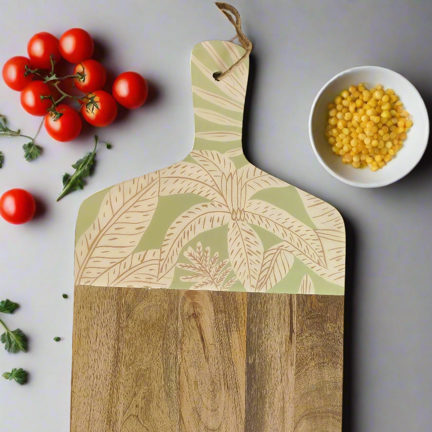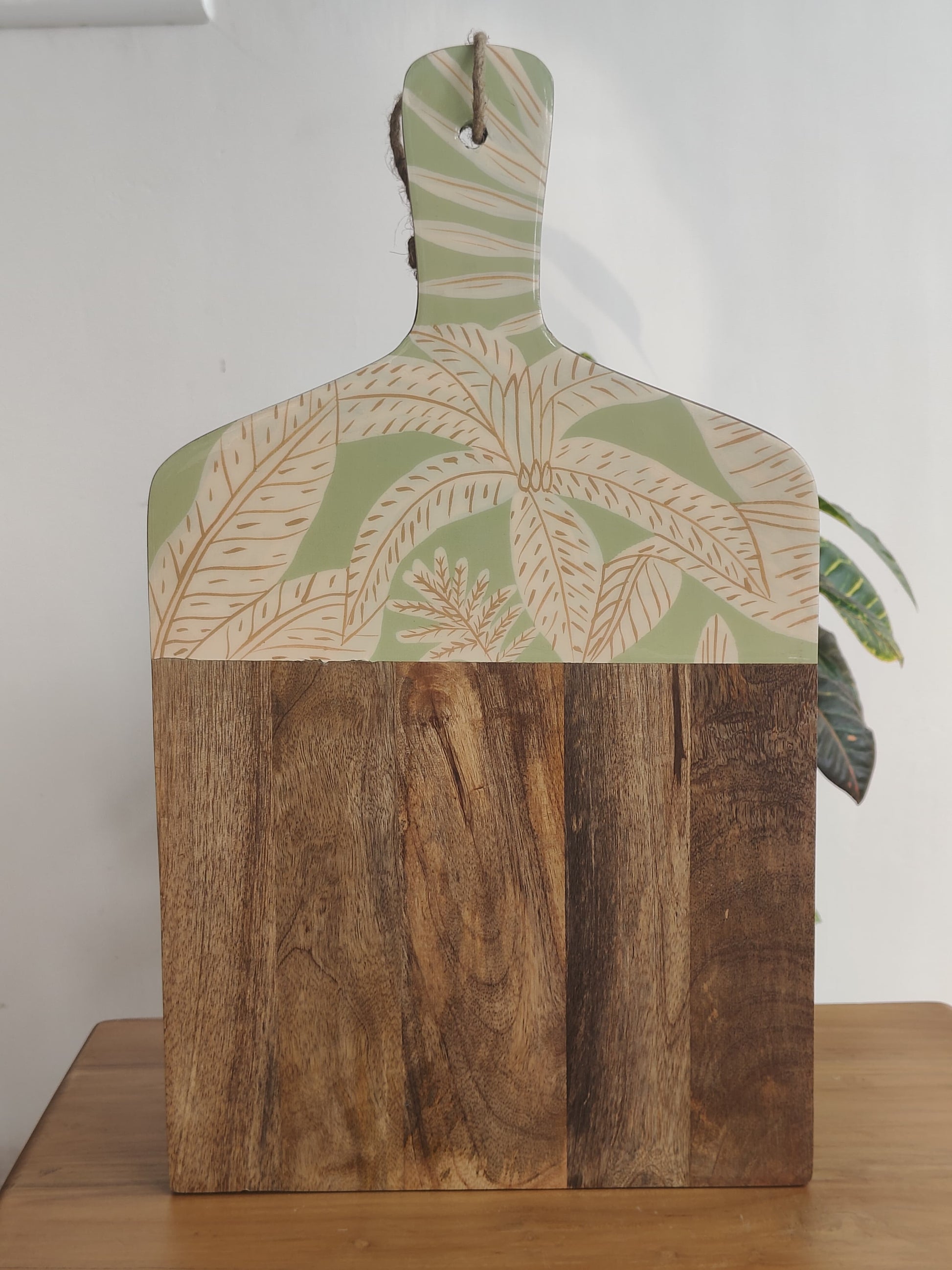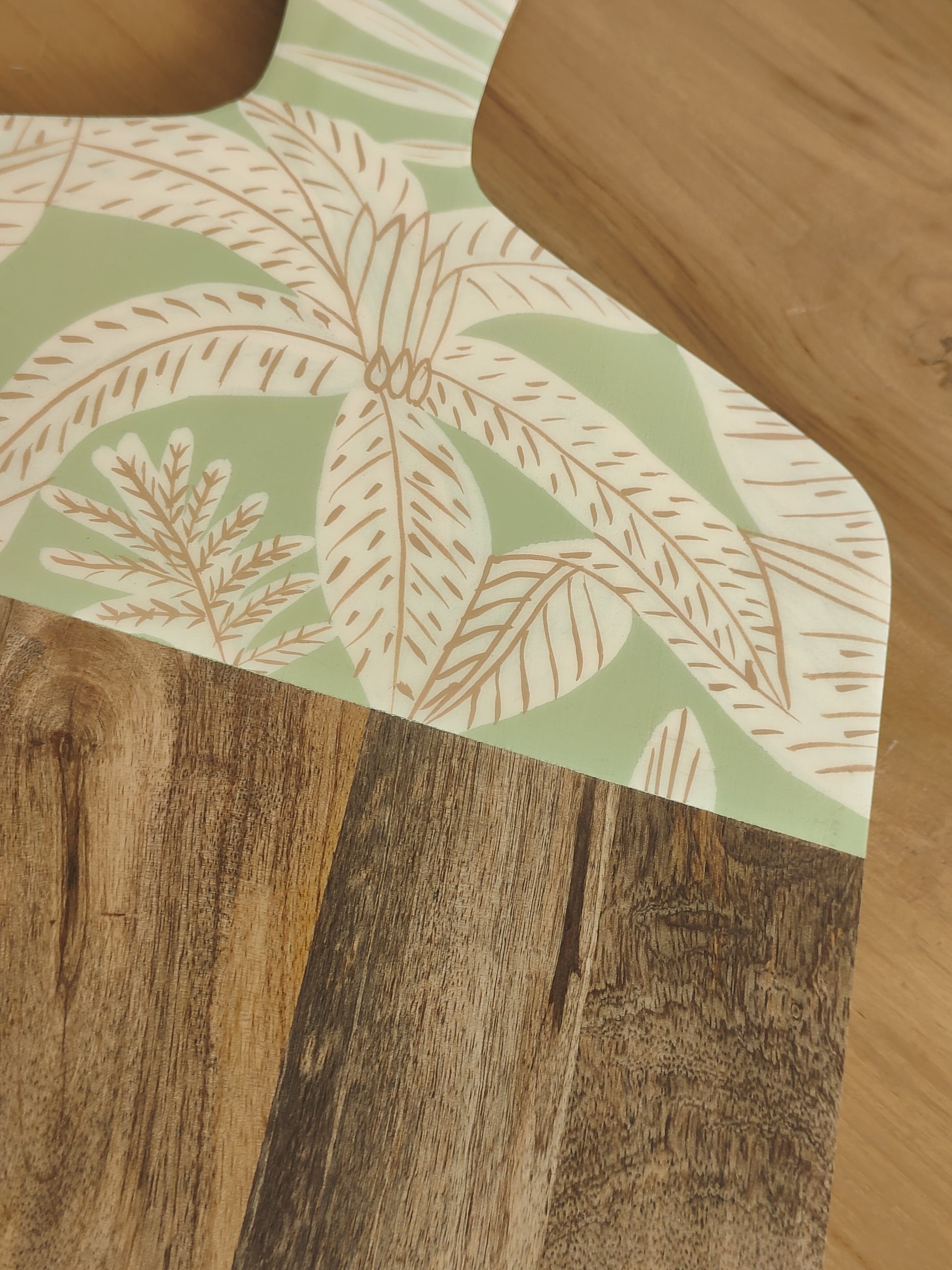 Add a touch of earthy elegance to your kitchen or table setting with the Botanical Breeze Serving Board. Crafted from natural wood, this board features a beautifully hand-painted botanical motif in soothing green and beige tones, balanced with a natural wood finish on the serving side.