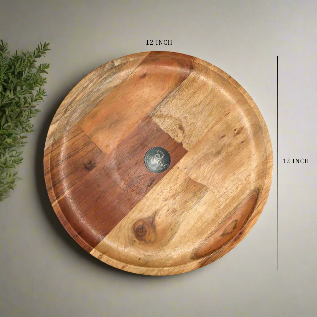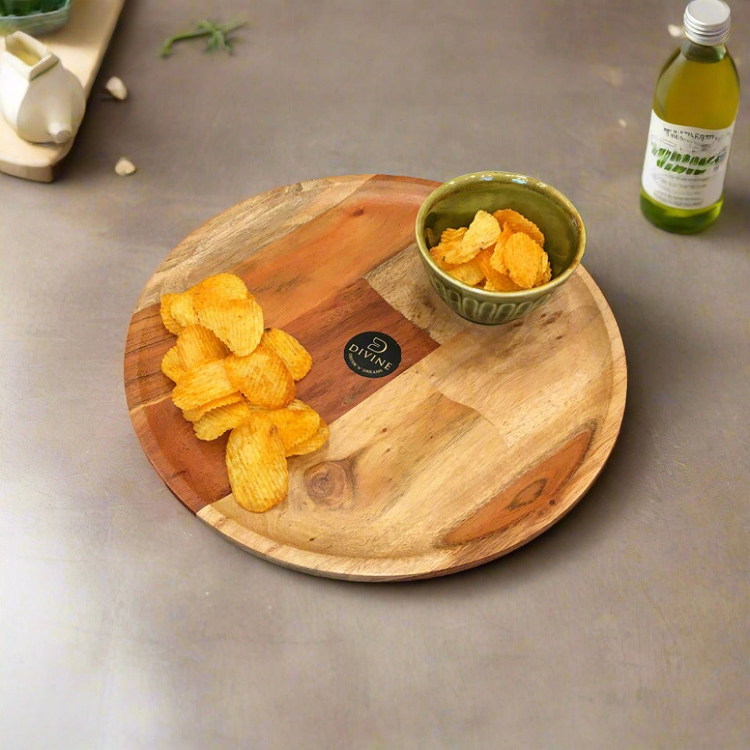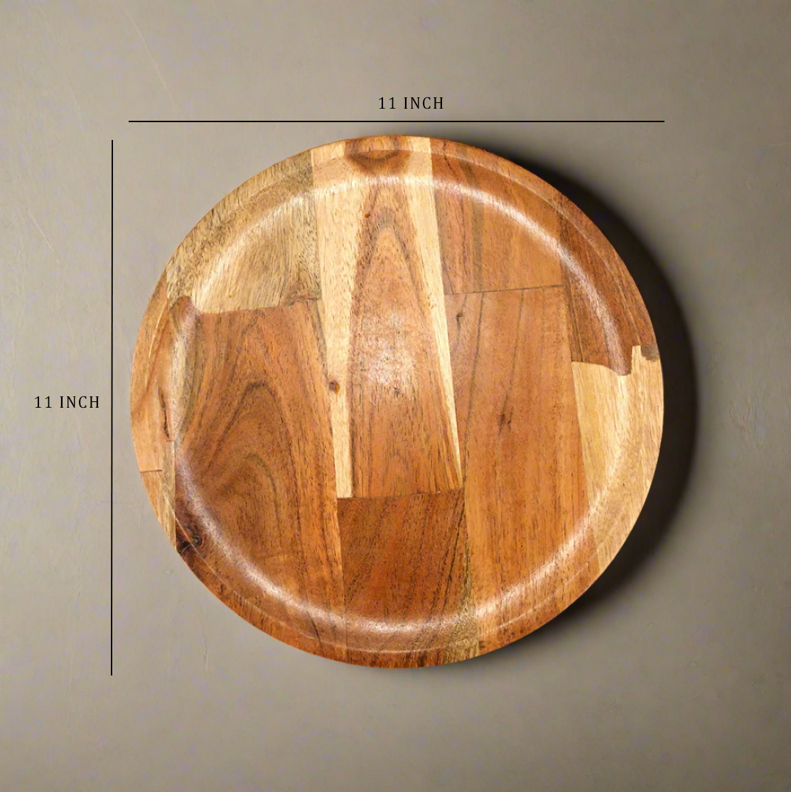 Wooden Serving Plate. Crafted from high-quality, sustainably-sourced wood, it showcases the natural grain and warm tones, making it a stunning base for serving appetizers, cheese, fruits, or desserts. Perfect for both casual meals and elegant gatherings, this plate brings an earthy charm to any table setting. Easy to clean and built to last, it's a timeless addition to your serveware collection.